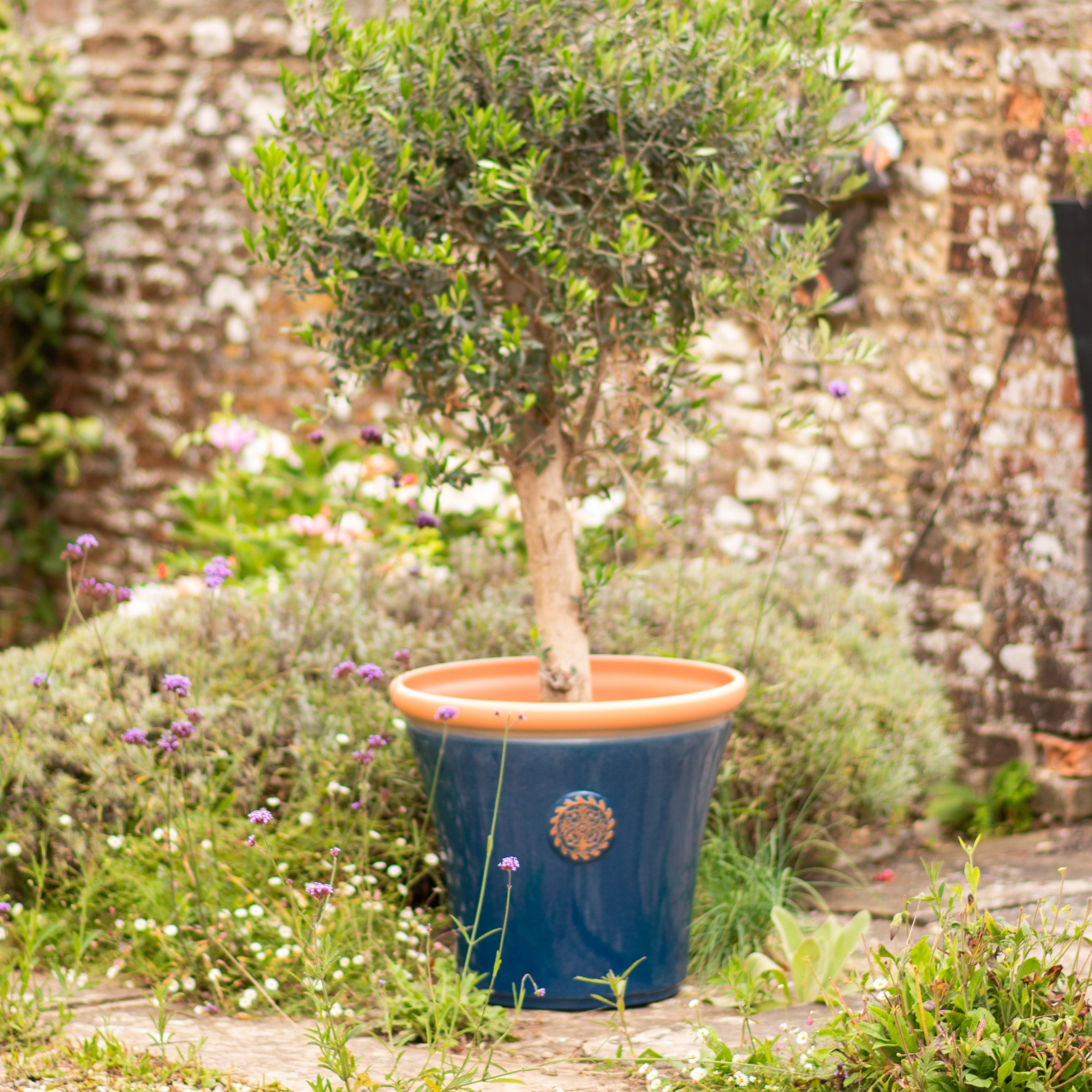 Ideal for patios, terraces, or tucked among flower beds, this pot is perfect for Mediterranean-inspired planting. Imagine a graceful olive tree standing proud, its silvery-green leaves beautifully contrasted against the deep blue pot. It also pairs wonderfully with aromatic herbs like rosemary and lavender, or vibrant blooms such as geraniums and bluebells, evoking the serene spirit of coastal gardens and country estates alike.