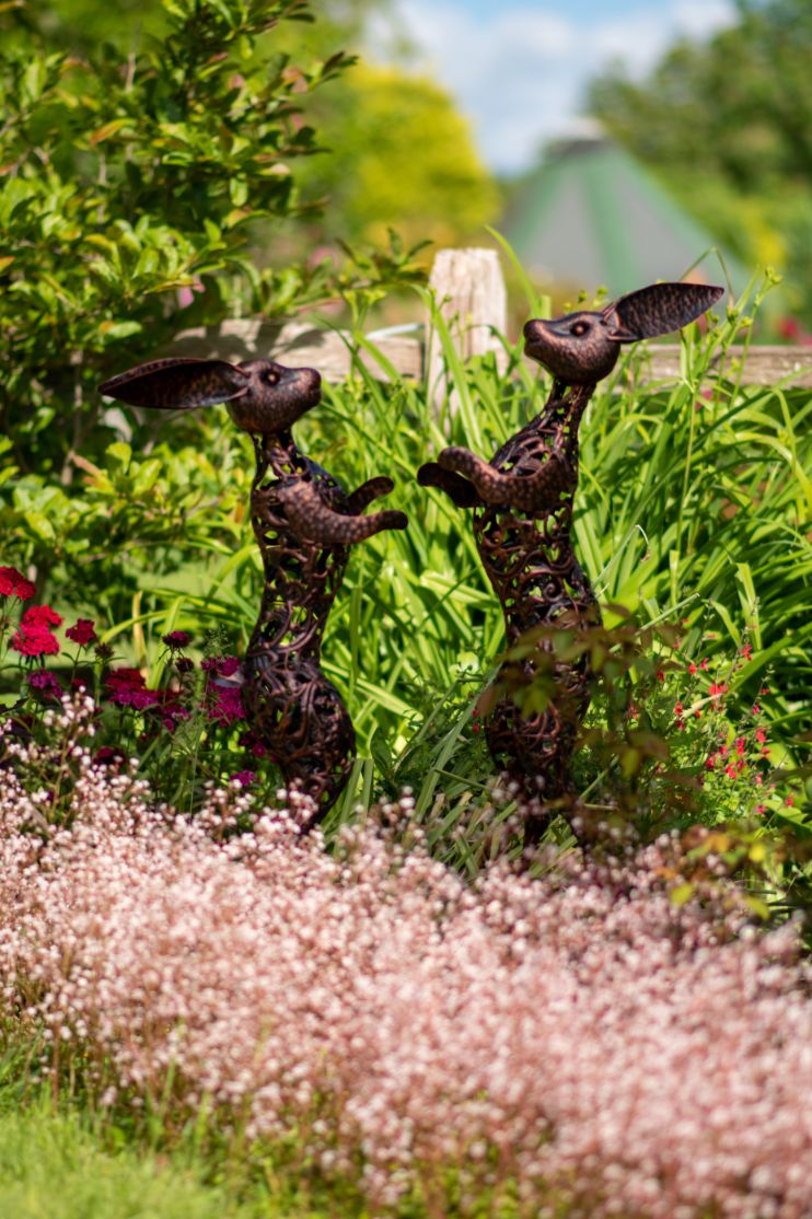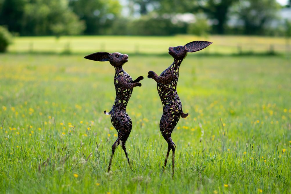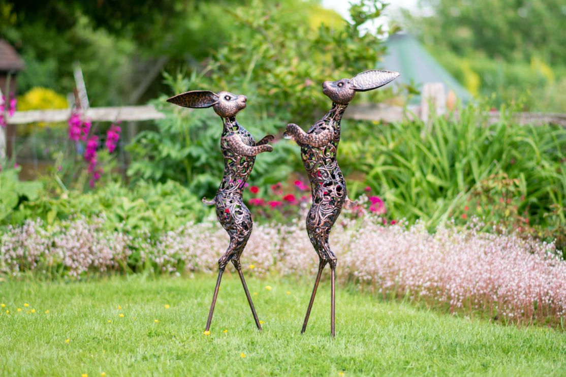 Enhance your outdoor decor with the enchanting Bronze Boxing Hares Sculpture. This exquisite piece is handcrafted with meticulous filigree detail and features a stunning bronze finish that will add a touch of elegance to any garden, patio, or poolside area. Constructed from weather-resistant materials, this sculpture is designed to thrive in outdoor environments, making it a perfect addition to your garden collection. Whether showcased as a standalone focal point or integrated into a larger garden display, this charming iron sculpture is sure to captivate and impress.