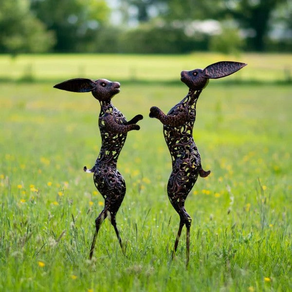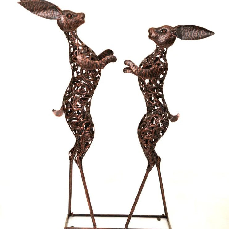 Enhance your outdoor decor with the enchanting Bronze Boxing Hares Sculpture. This exquisite piece is handcrafted with meticulous filigree detail and features a stunning bronze finish that will add a touch of elegance to any garden, patio, or poolside area. Constructed from weather-resistant materials, this sculpture is designed to thrive in outdoor environments, making it a perfect addition to your garden collection. Whether showcased as a standalone focal point or integrated into a larger garden display, this charming iron sculpture is sure to captivate and impress.