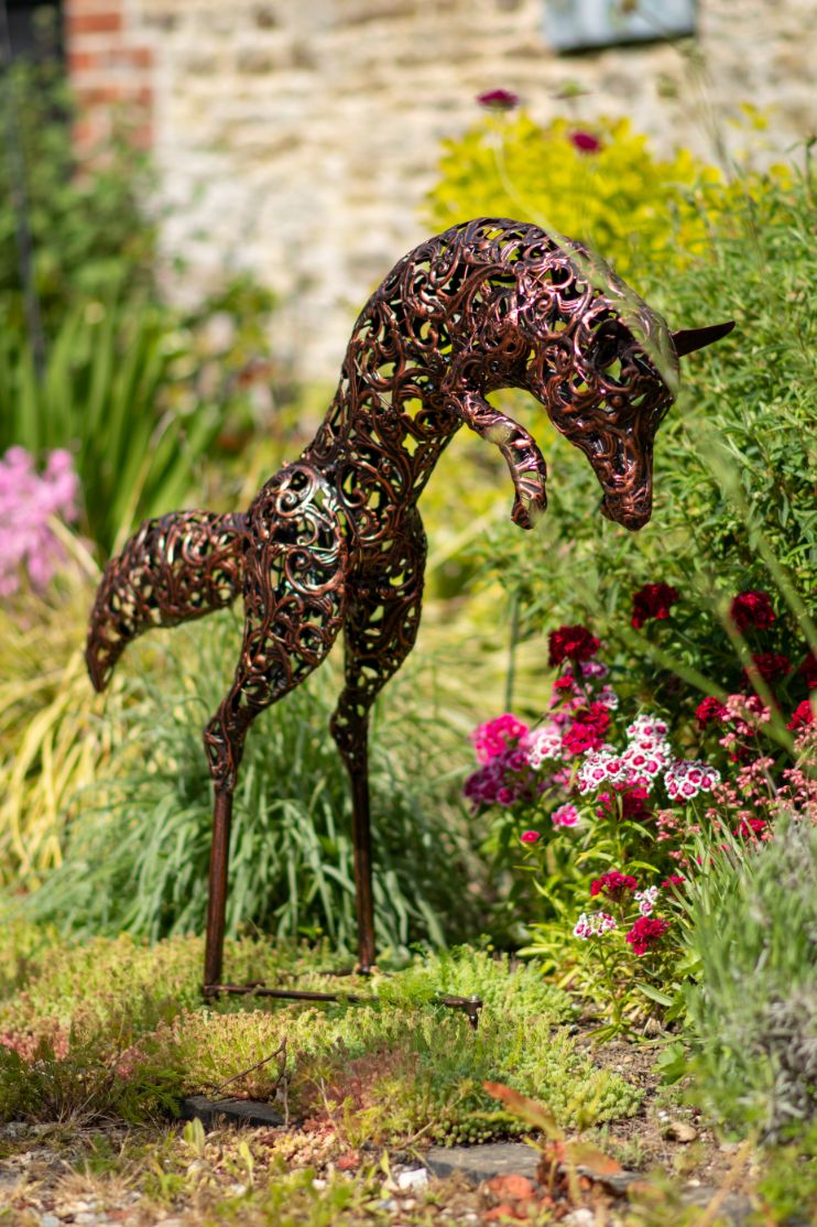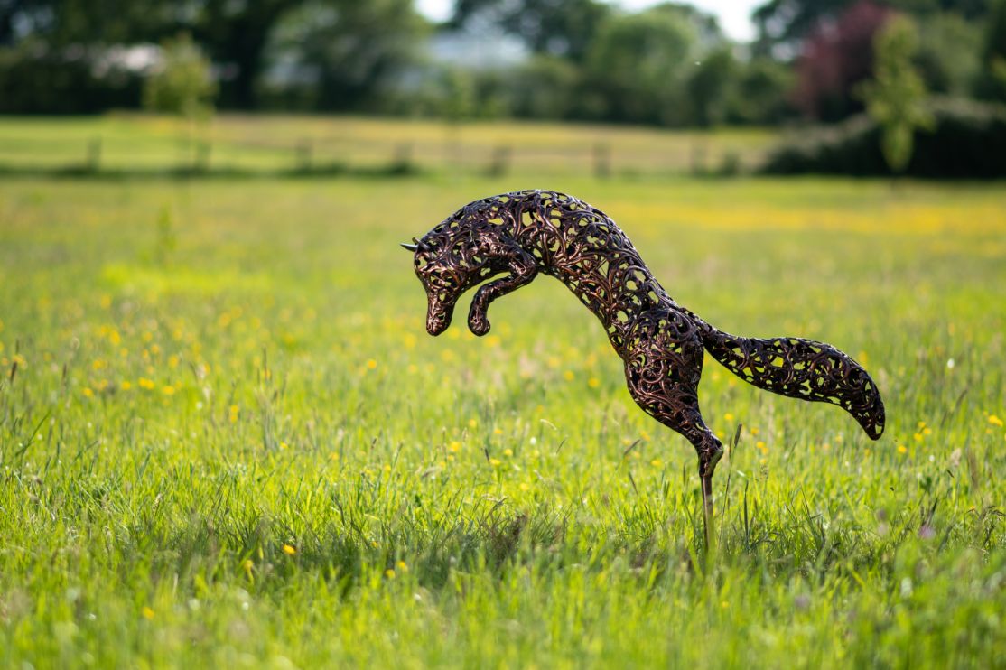Handcrafted with intricate filigree detail, this stunning Bronze Leaping Fox Sculpture will add a touch of elegance to any outdoor space. The beautiful bronze colouring of the sculpture will complement any garden, patio, or poolside setting. Made of durable and weather-resistant iron, this piece is perfect for outdoor decor and will maintain its exquisite appearance in all types of weather. Whether placed in a garden or by a reflective mirrored surface, this unique sculpture will be a striking addition to any outdoor space.